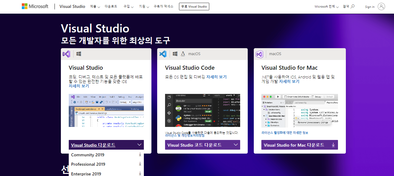 1. visualstudio.microsoft.com/ko/ 사이트에 접속한다.