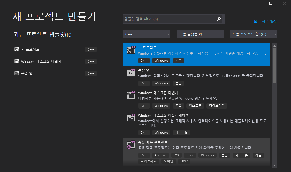 2. 언어를 C++로 바꾸고 빈 프로젝트 클릭