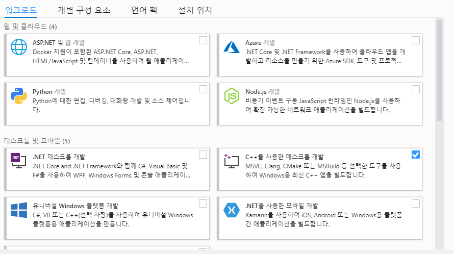 3. c++를 사용한 데스크톱 개발을 클릭후 설치한다.