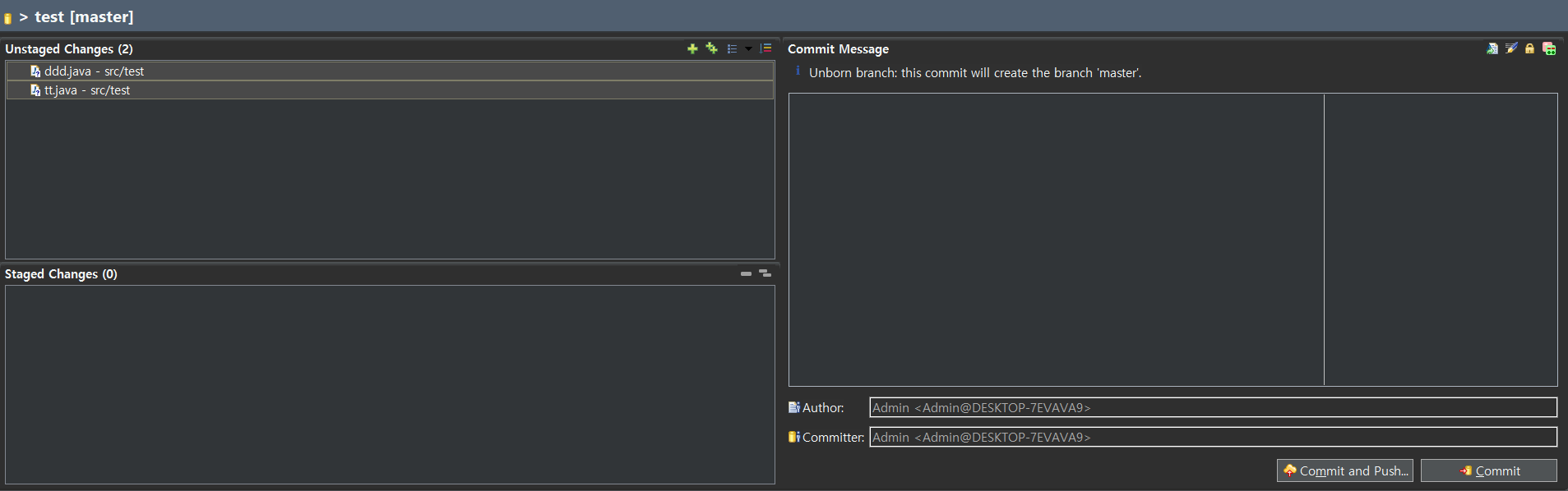 11. Unstaged Changes 오른쪽 + 모양을 클릭 후 메시지를 입력하고 commit and push 클릭