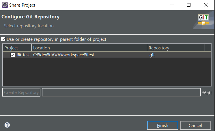3. Use or create repository in parent folder of project , 프로젝트, Create Repository 클릭 후 finish 버튼을 클릭함