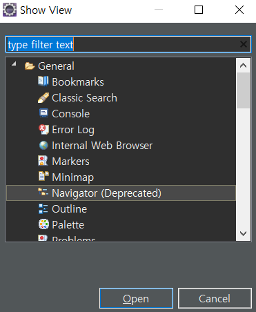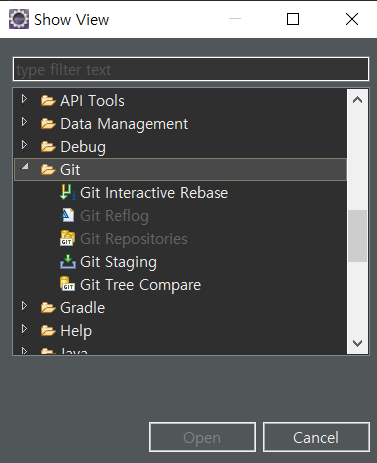 4. window - show view - other에 git repositories와 git staging 선택 그리고 general에 navigator 선택 후 open