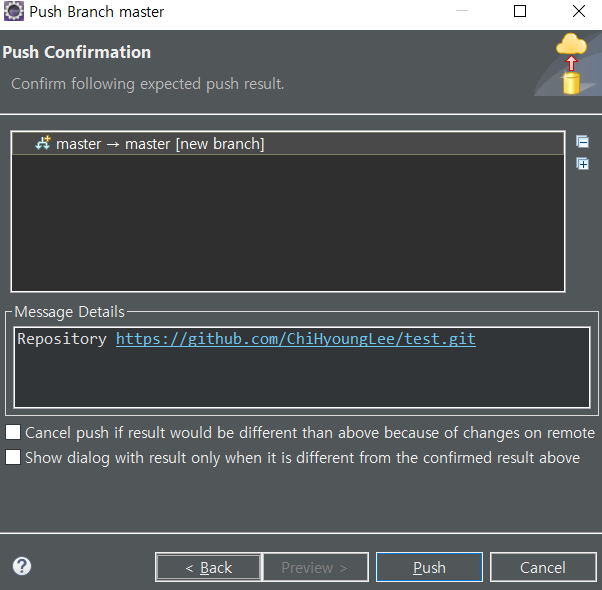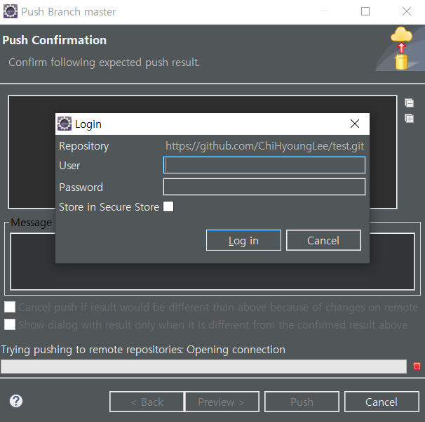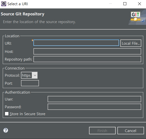 9. 주소를 복사하면 자동으로 Location 부분이 채우지고 User와 Password에 깃허브 아이디와 비밀번호를 입력 후 finish클릭