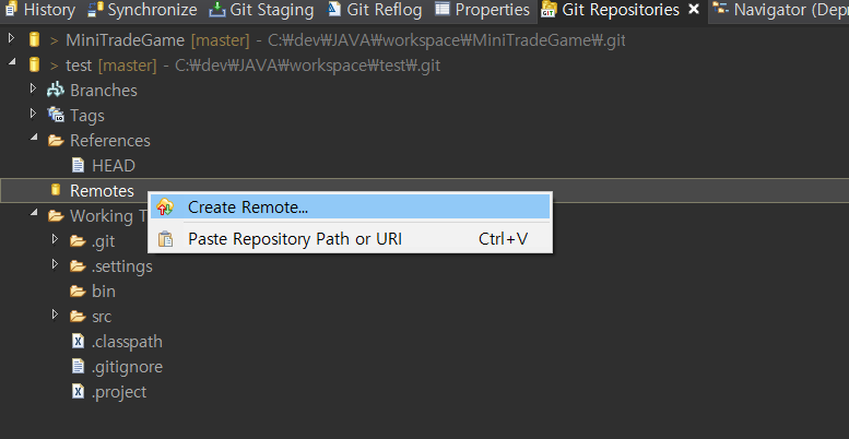 7. git repositories에서 Remotes 마우스 우클릭 후 Create Remote를 클릭